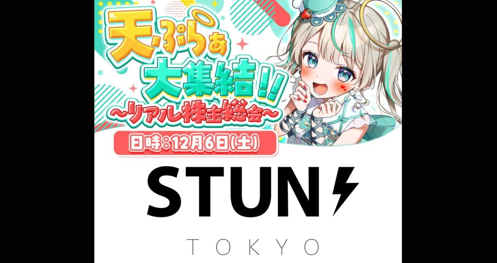 身バレ系Vtuber⁉️「天羽しろっぷ」様による初ファンミーティング✨ 「 天ぷらぁ大集結!! 〜リアル株主総会~」 12月6日(土)STUNTOKYOにて開催決定🎊 イベント限定のコラボドリンクやグッズもお楽しみに! 皆さまのご来場をお待ちしております☺️🍀 🎫チケットサイト http://x.gd/e8U77 🛍グッズ一覧 https://x.gd/xNjYK